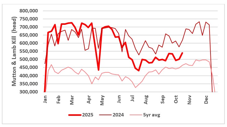 Chart shows combined lamb and mutton kill 2025 vs 2024 and five-year average. Source: MLA