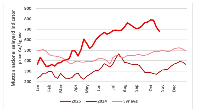 This chart shows the national saleyard indicators prices for mutton this year vs 23/24 and seven-year average. Source: MLA