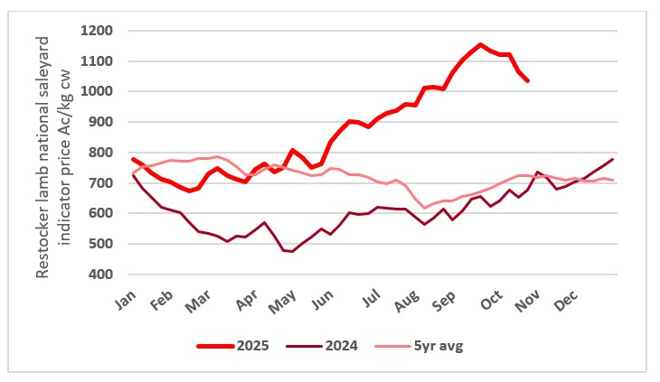 This chart shows the national saleyard indicator prices for restocker lambs in 2025 vs 2024 vs five-year average. Source: MLA