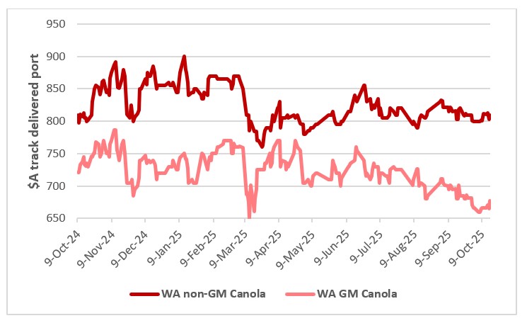 This chart shows the non-GM and GM canola price delivered WA port in $A/t. Source: LSEG.