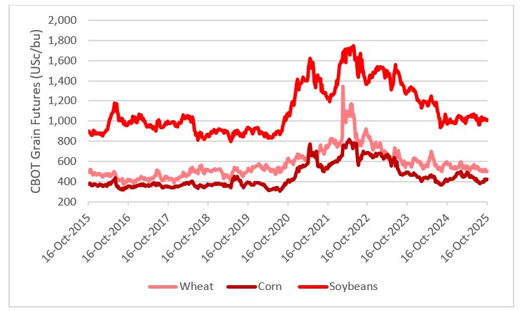 The latest estimate from respected analyst Dr Cordonnier has yields of 181/acre (ac) vs 186.7/ac (Sept USDA1 estimate). With US corn exports ripping along, any further significant revision to US corn yields could have a material effect on US and global carryout stocks. At this stage however, it is unlikely that projected changes in the corn balance sheet alone will be enough to change global corn or grain market sentiment, particularly given forecast for another record south American crop in 2026/27.