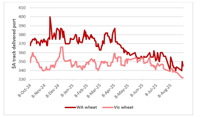 This chart shows the track prices for APW wheat delivered WA and VIC port in $A/t. Source: LSEG Workstation.